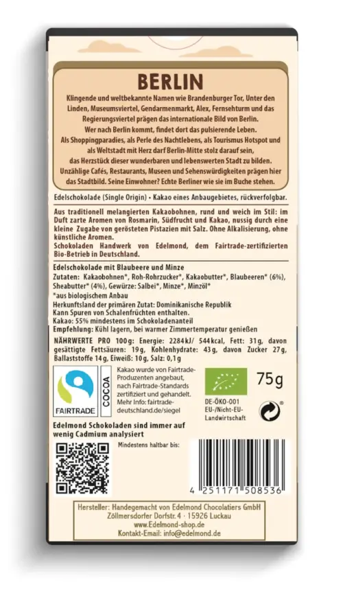 Mit jedem Stück schmecken Sie ein Stück Berlin – vom Brandenburger Tor über die Museumsinsel bis zum Fernsehturm. Diese besondere Schokolade vereint regionalen Stolz mit weltbewusster Herstellung.