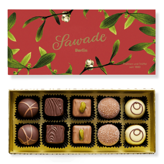 Die Pralinenschachtel „Mistelzweig“ zählt zu den beliebtesten Klassikern der Berliner Manufaktur Sawade – und das zu Recht. Mit ihrem festlichen Motiv und einer erlesenen Auswahl alkoholfreier Pralinen ist sie das ideale Weihnachtsgeschenk für Genießer jeden Alters.